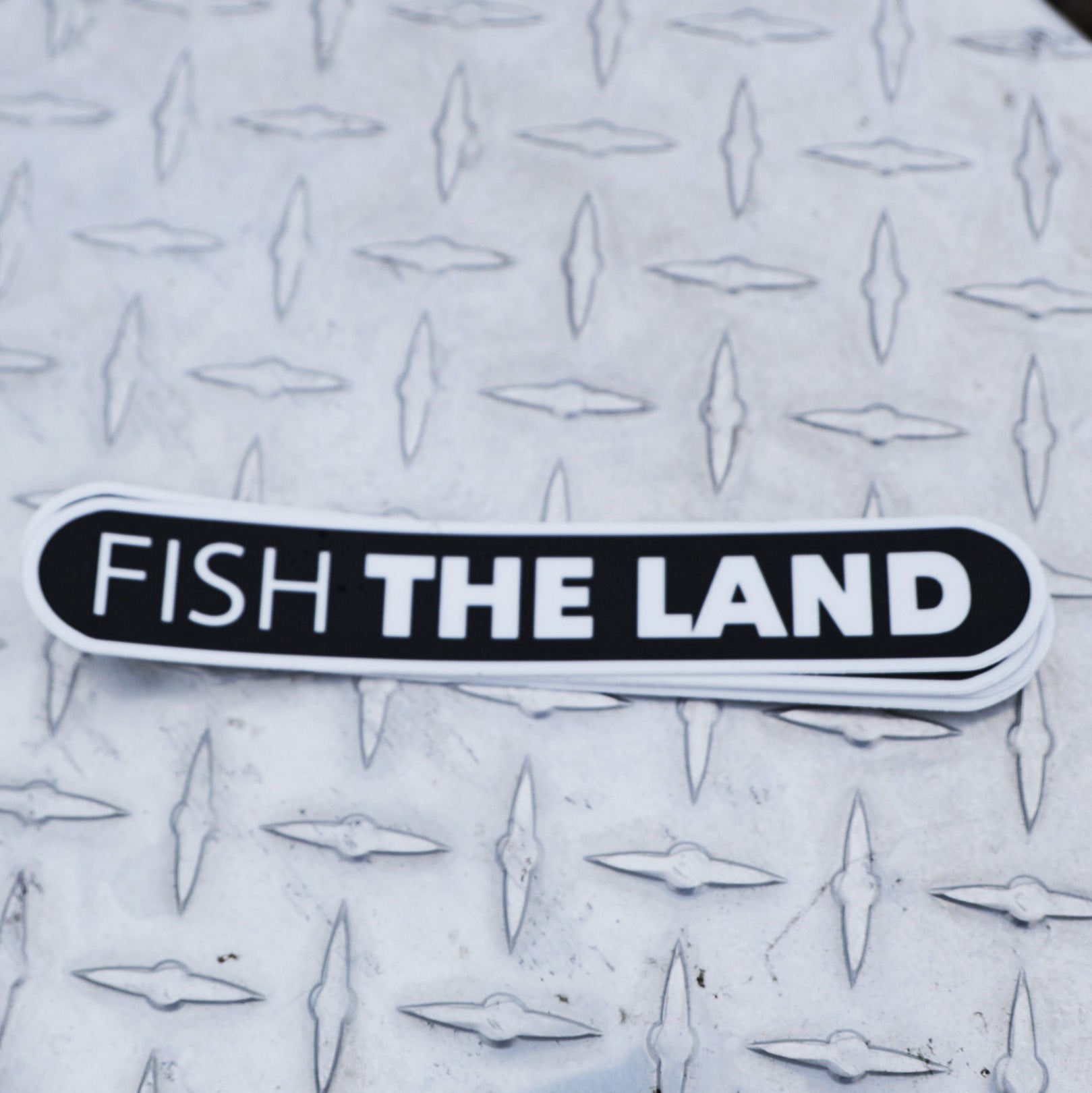 Fish The Land. A simple black and white sticker that says what you love to do, where you love to do it.