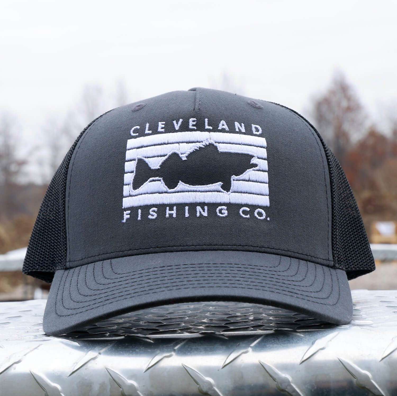 The Cleveland Fishing Flag embroidered on a 5 panel Charcoal trucker hat. Featured on the CFC flag is one of our favorite freshwater species, the Walleye. Cleveland is home to our small fishing company and happens to be at the center of what we consider the best fishing around!